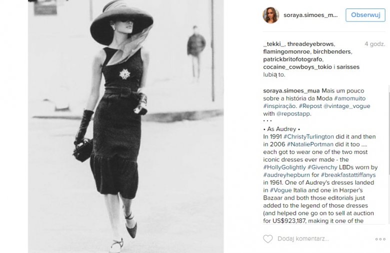1953 rok - Rzymskie wakacje, 1961 - Śniadanie u Tiffany’ego. Najbardziej kultowe filmy epoki, do dziś żywe i obecne w naszej kulturze. Tak samo jak aktorka, która zagrała w nich główne role. Audrey Hepburn wywarła niesamowity wpływ na sposób jaki się ubieramy dziś. Wtłoczyła nam do głowy to, co teraz powszechnie uważamy za eleganckie. Balerinki, marynarskie paski, mała czarna, beżowy trencz. W latach 50-tych wszystkie kobiety chodziły na obcasach, ale Audrey, była baletnica, uważała, że jest na nie za wysoka. Stąd baletki. Jej styl? Prostota, ograniczona paleta barw (dużo czerni: czarny golf, czarne leginsy, mała czarna…), podkreślona talia – przez rozkloszowane spódnice lub koszule związane w talii. Duże oczy, mocno podkreślone brwi, czarna kreska na powiece. I nieśmiertelne motto, w które również wierzę: „Happy girls are the prettiest”.